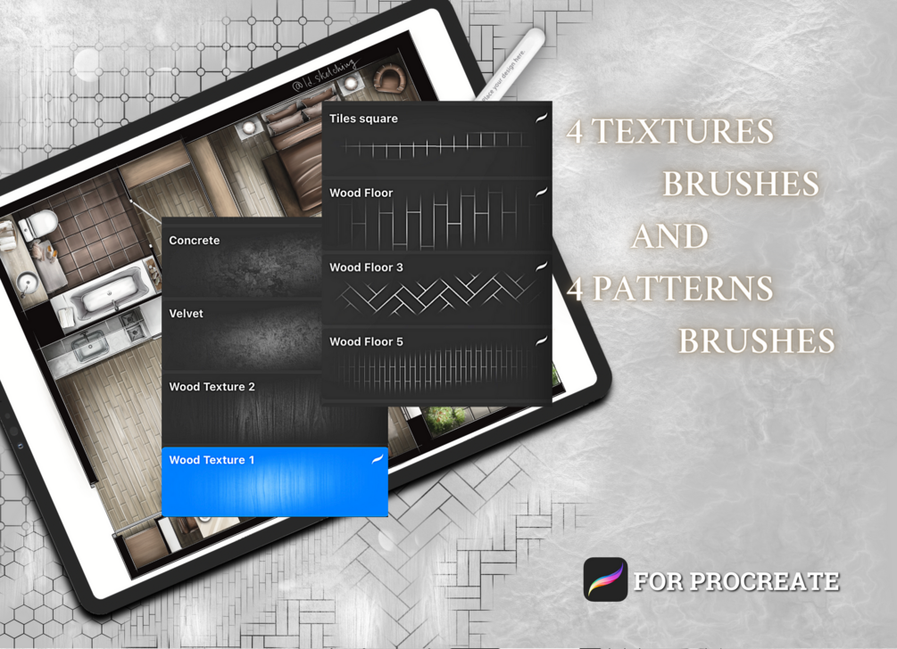 FREE Procreate brushes for interior sketch, procreate architecture, sketch plan brushes, textures brush, interior plan, tiles brushes, patterns